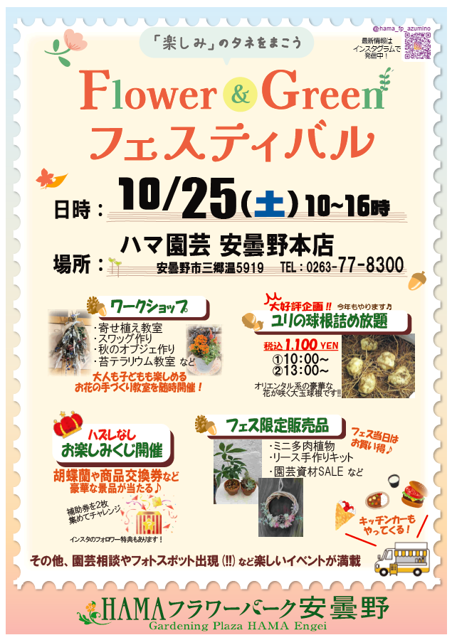 伊那食品工業株式会社のグループ会社、ハマ園芸株式会社(本社:長野県安曇野市、代表取締役社長:塚越亮)が 運営する「HAMAフラワーパーク安曇野」にて、10月25日(土)に 『Flower & Greenフェスティバル』 を開催します。