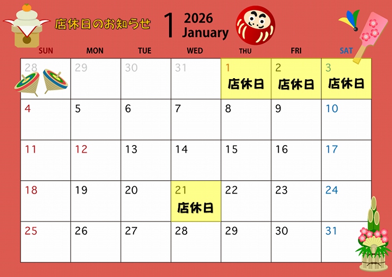 1月店休日のお知らせです。