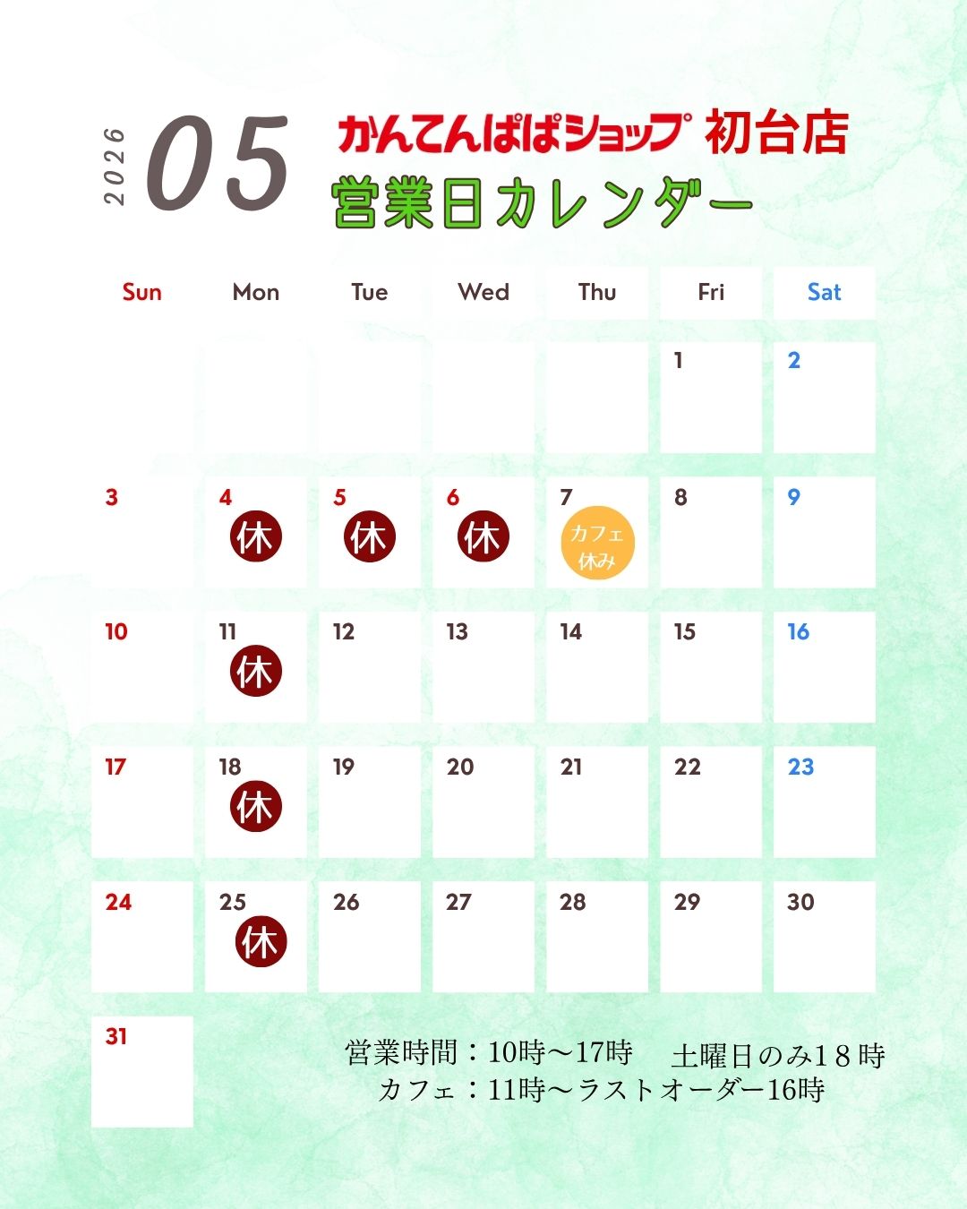 5月7日㈭ 喫茶・ランチはお休みとなります。