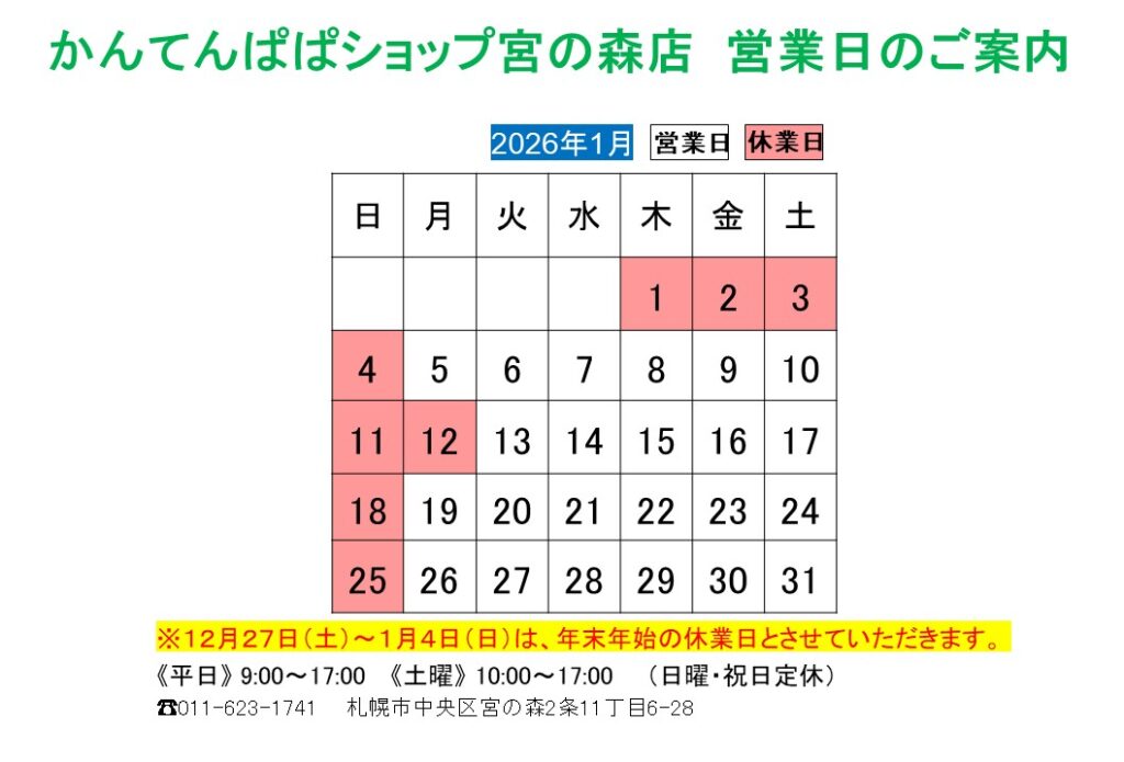 1月の営業カレンダーです。