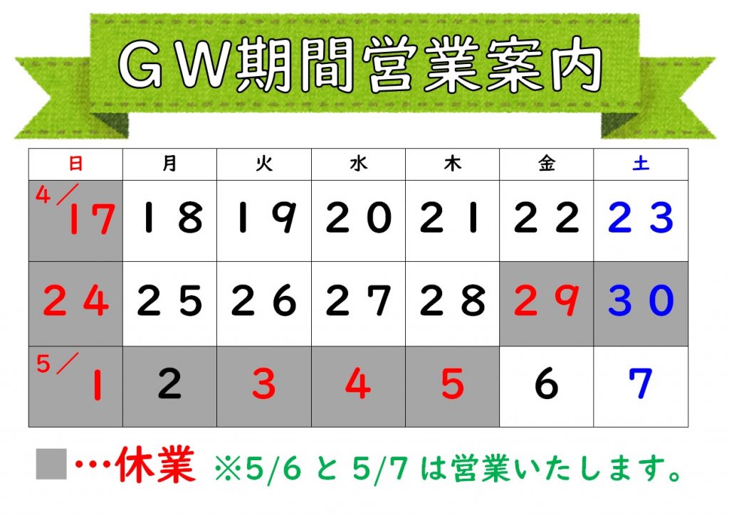 GW期間の営業案内です。