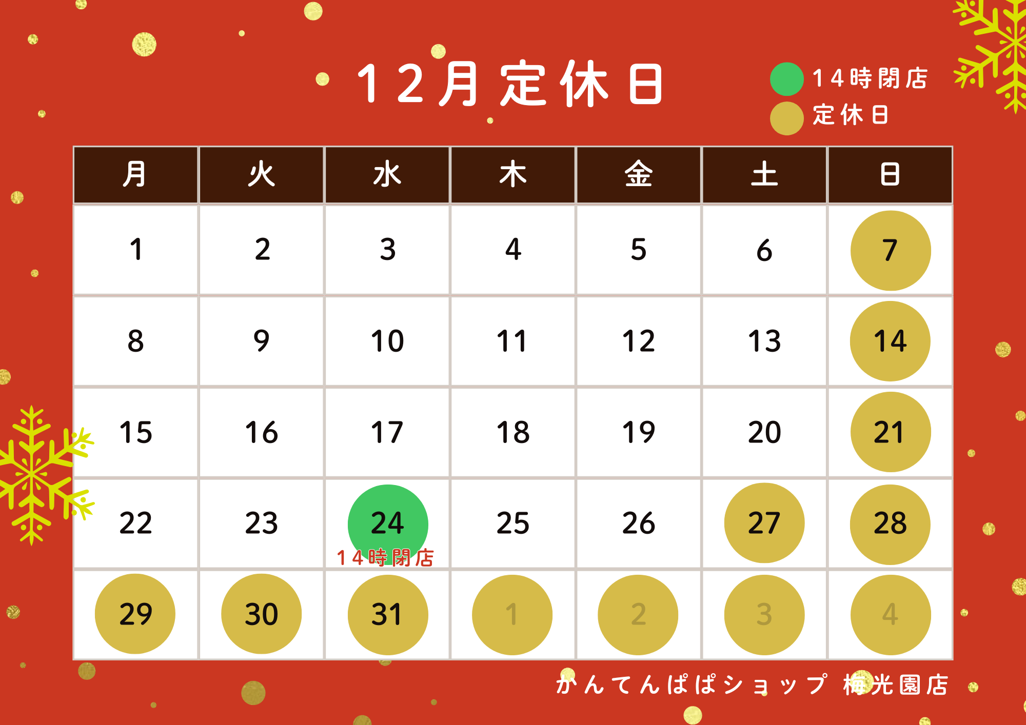 年末年始休業:12月27日(土)~1月5日(日)まで