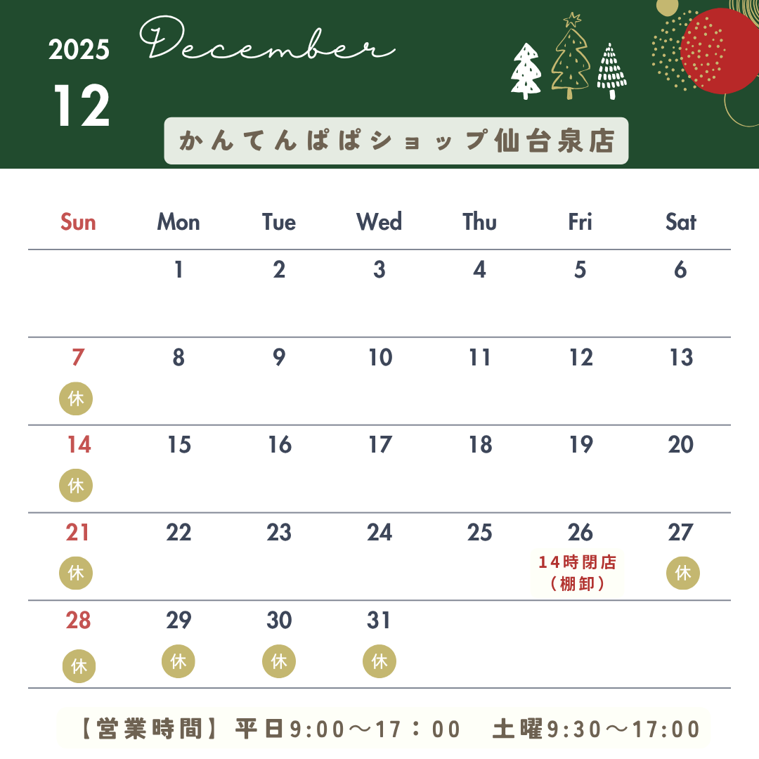 ※12月26日(金)は棚卸しのため、14時閉店とさせていただきます。